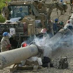Mientras los soldadores realizaban modificaciones a las l铆neas y al colector para agregar un tanque de lodos, un asistente de soldador sujetaba las l铆neas y colectores en posici贸n con la bomba centr铆fuga para que pudieran ser fijados en el lugar con soldadura.