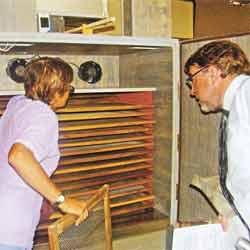 Una de las beneficiarias del proyecto y un representante de los organismos cooperantes, supervisan el área de secado de las frutas.
